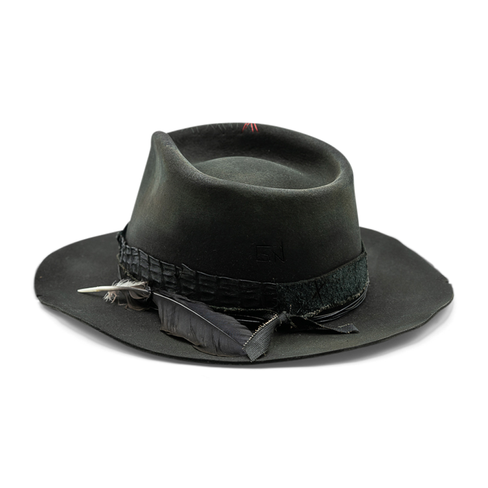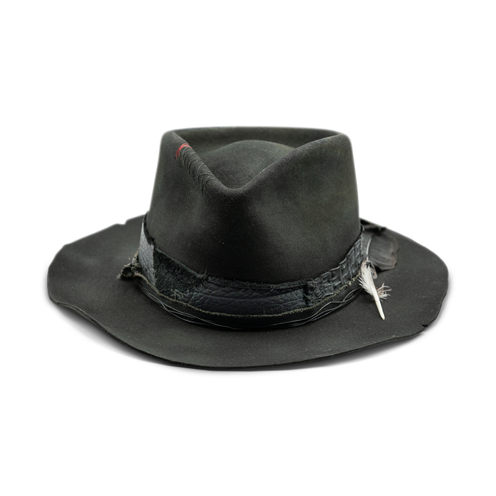 Rock & Roll is not about perfection. It’s about character. Shaped from deep black felt, this hat carries a raw, lived-in elegance. The crown is deliberately sculpted, the brim slightly irregular — a reminder that real style is never too clean, never too controlled. A distressed leather band wraps the base, layered with subtle textures, hand-placed details and a single feather accent — understated, almost defiant. Every mark, every crease tells a story of movement, nights that run long, and roads that don’t ask for permission. Rock & Roll is made for those who don’t follow trends. They wear their own rhythm. Handcrafted. Unpolished by design. No two pieces are the same — and that’s exactly the point.