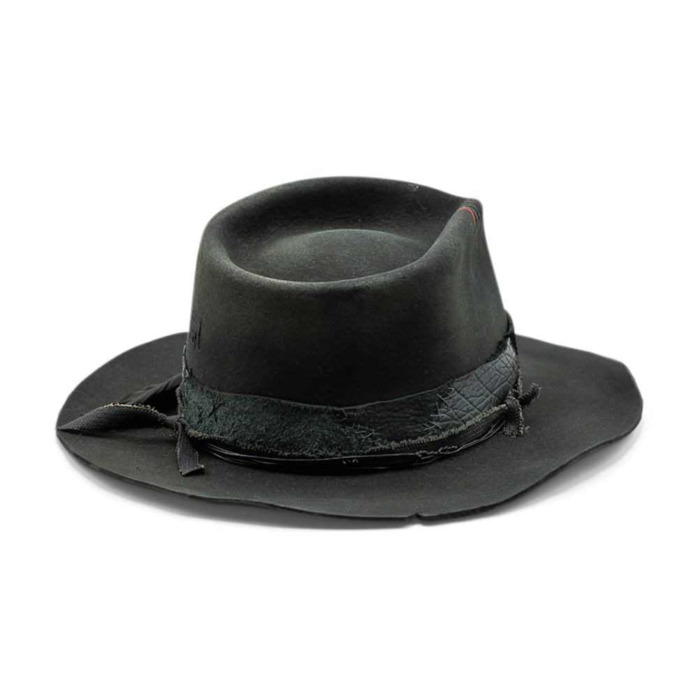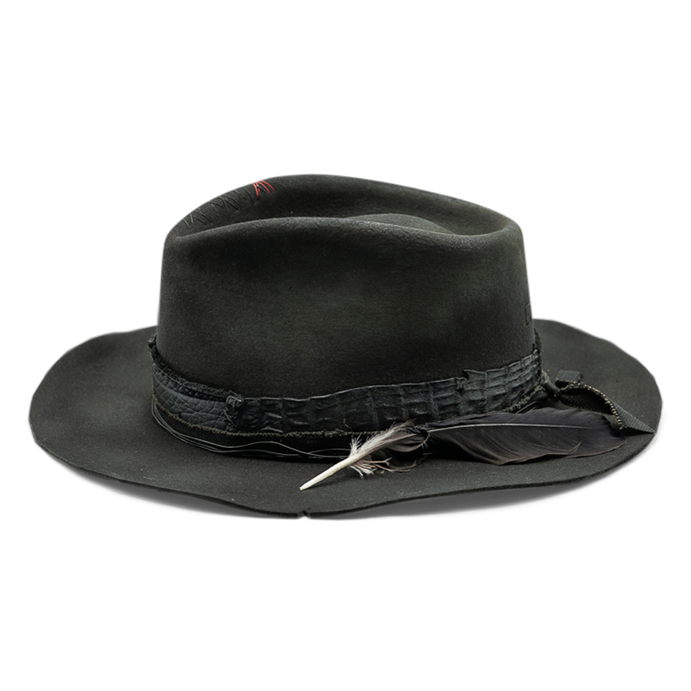 Rock & Roll is not about perfection. It’s about character. Shaped from deep black felt, this hat carries a raw, lived-in elegance. The crown is deliberately sculpted, the brim slightly irregular — a reminder that real style is never too clean, never too controlled. A distressed leather band wraps the base, layered with subtle textures, hand-placed details and a single feather accent — understated, almost defiant. Every mark, every crease tells a story of movement, nights that run long, and roads that don’t ask for permission. Rock & Roll is made for those who don’t follow trends. They wear their own rhythm. Handcrafted. Unpolished by design. No two pieces are the same — and that’s exactly the point.